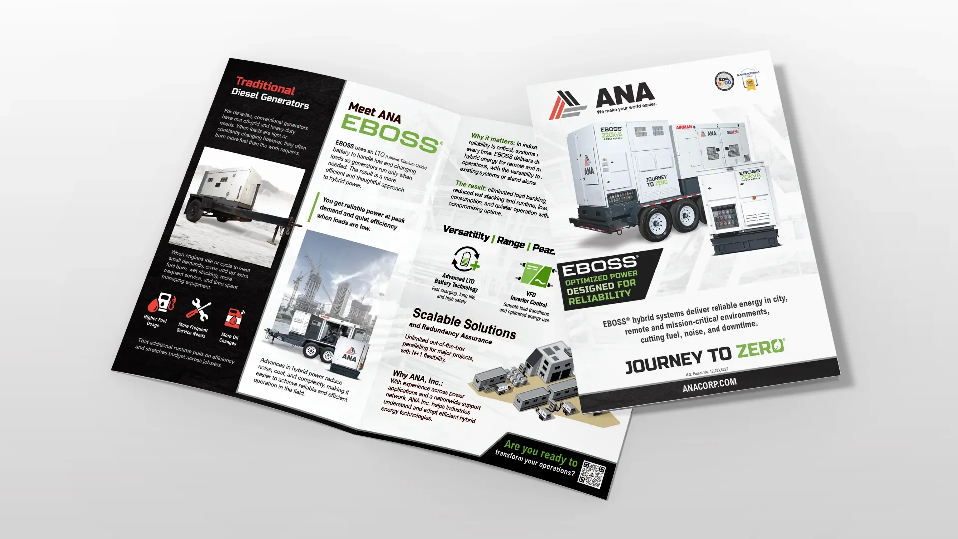 ANA’s EBOSS technology is revolutionary in the power generation space. It’s been proven to save on emissions and fuel usage by up to 80%, and while it has quite a bit higher initial cost compared to competition, the overall savings is substantial. The issue is helping customers to understand the products place in the industry. I was tasked to design this brochure as the first introduction to the product.